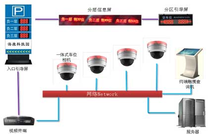 系統(tǒng)主要包含智能停車誘導、智能視頻尋車和視頻監(jiān)控等功能。整體系統(tǒng)以智能停車場管理系統(tǒng)iVMS-8640平臺為依托,管控整個停車場的業(yè)務功能。其中智能停車誘導主要通過LED電子顯示屏和車位像機指示燈的方式指引車主停車。智能視頻尋車通過在終端觸摸查詢機上輸入車牌號碼的方式定位車輛所停車位。車位相機全覆蓋停車場所有停車位,兼顧了車位監(jiān)控的功能,業(yè)主無需另外配置監(jiān)控像機,節(jié)省用戶成本。